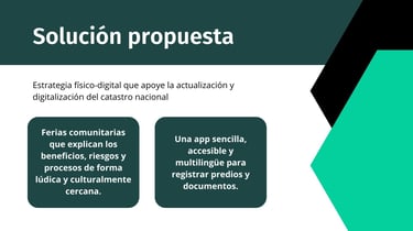 La solución de nuestro equipo se basó en realizar una campaña a través de un evento llamado "Feria del Catastro" en zonas que faltan de añadir al registro mediante la cual se hablaría a los habitantes de los beneficios de formalizar sus tierras y se introduciría esta app para facilitar el proceso de digitalización.